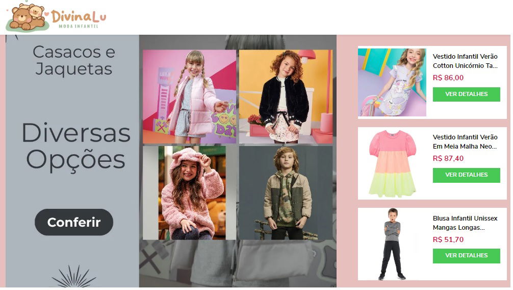 Descubra o universo mágico da Divinalu Moda Infantil, onde cada peça é mais que uma roupa, é uma celebração da infância. Renove o guarda-roupa dos pequenos com estilo, qualidade e o encanto que só a Divinalu pode proporcionar. Vista alegria, vista Divinalu!