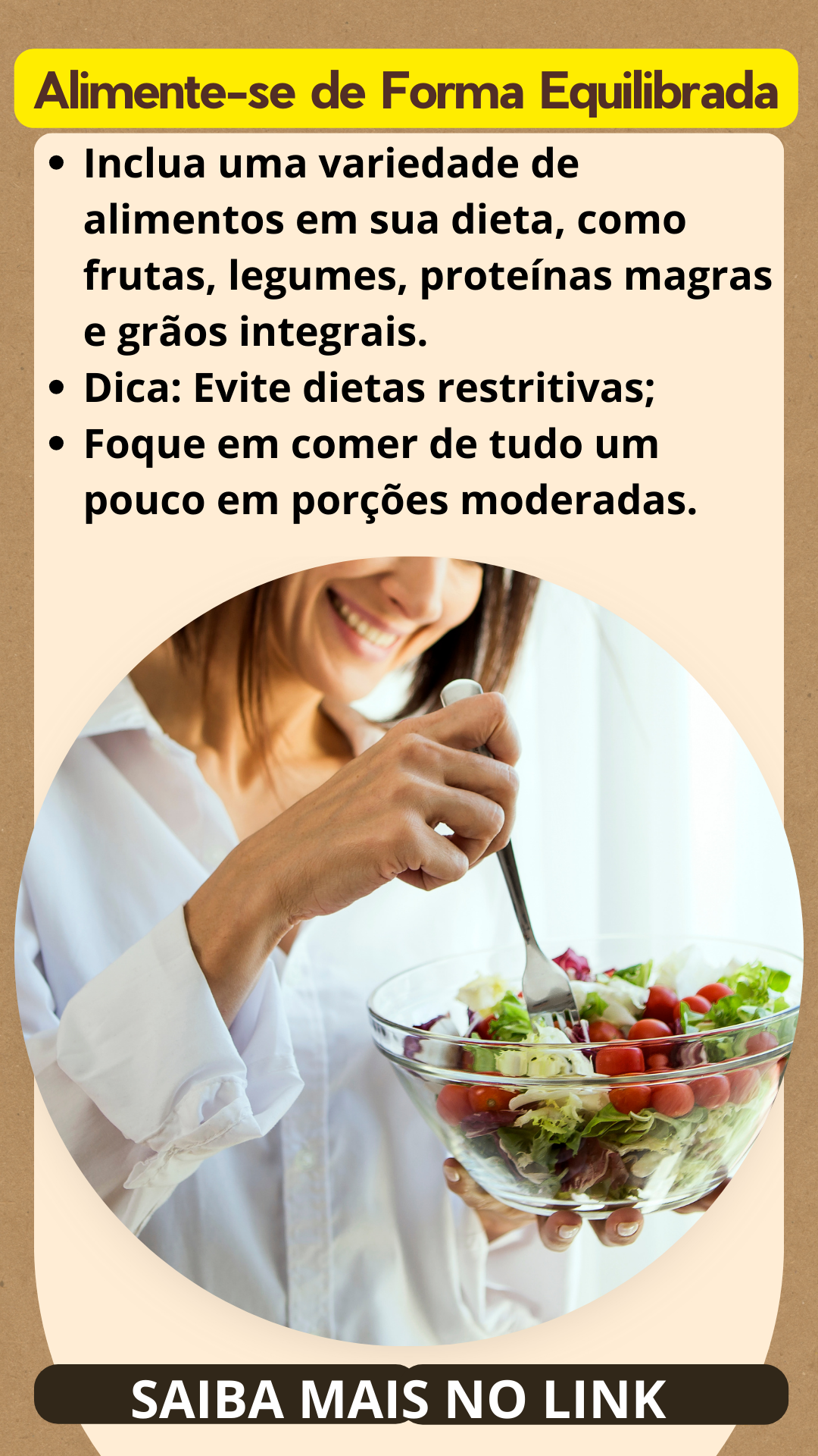 Inclua uma ampla variedade de alimentos em sua dieta, como frutas, legumes, proteínas magras e grãos integrais.