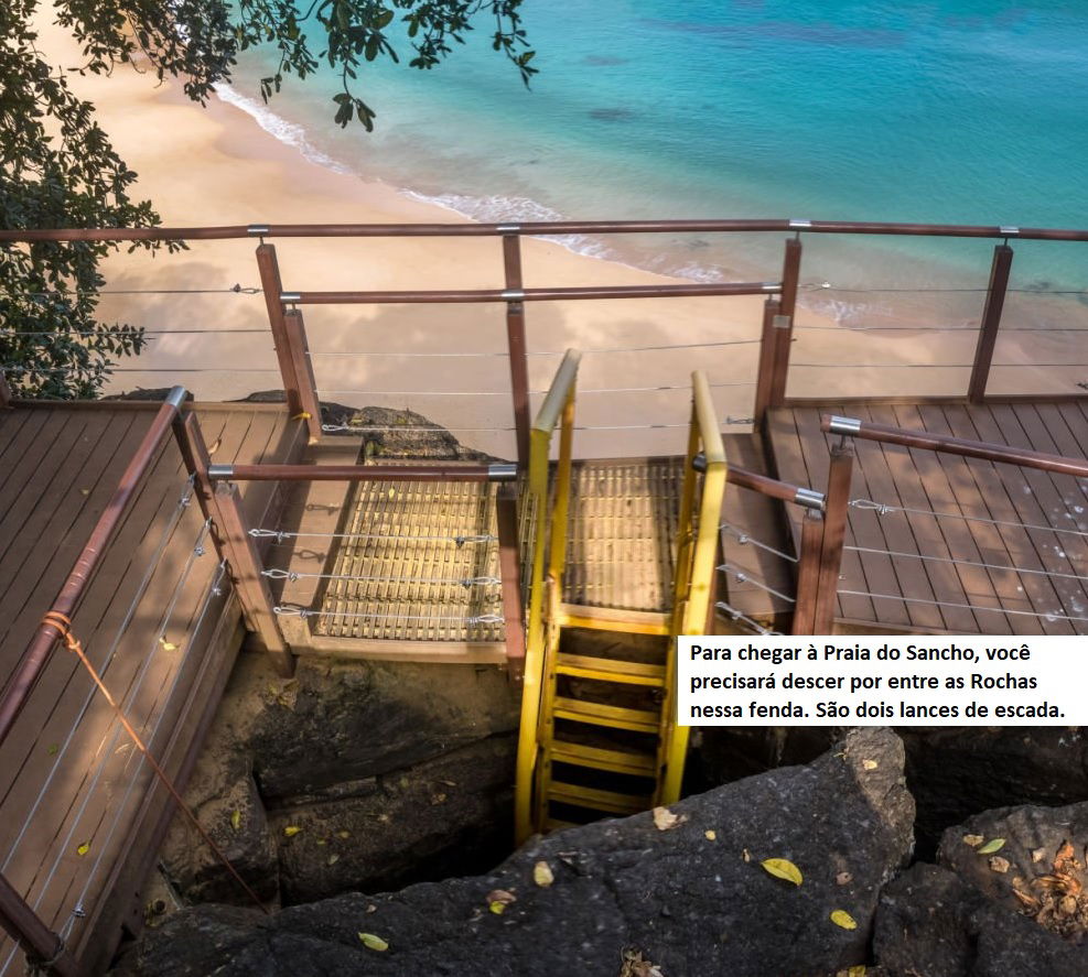 A trilha para a Praia do Sancho começa em um ponto conhecido como Mirante do Sancho, onde os visitantes podem desfrutar de vistas espetaculares da costa e do mar azul-turquesa abaixo. A partir daí, a trilha segue por uma série de degraus esculpidos na rocha e passarelas (foto acima) suspensas, que descem em direção à praia.